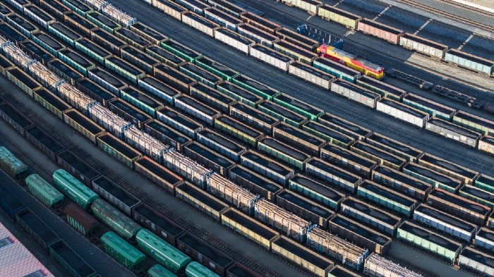 2025年10月18日,在中國鐵路哈爾濱局集團有限公司綏芬河站南場,滿載進口貨物的列車等待解體換裝(無人機照片)。